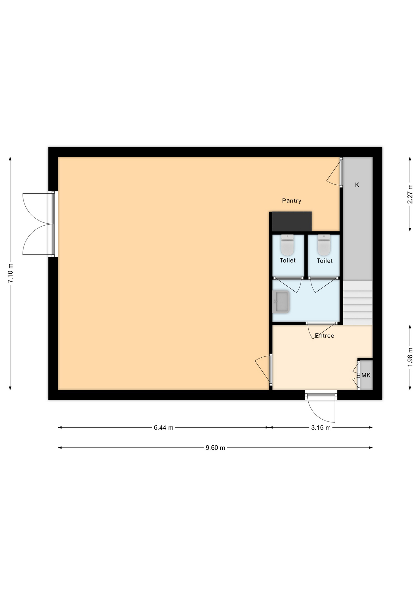 De kantoorruimte heeft een totaaloppervlakte van ca. 140 m², verdeeld over de begane grond en de eerste verdieping. Beide verdiepingen kunnen volledig worden ingericht en gebruikt als kantoorruimte. De eerste verdieping is te bereiken via een vaste trap en is voorzien van te openen ramen.