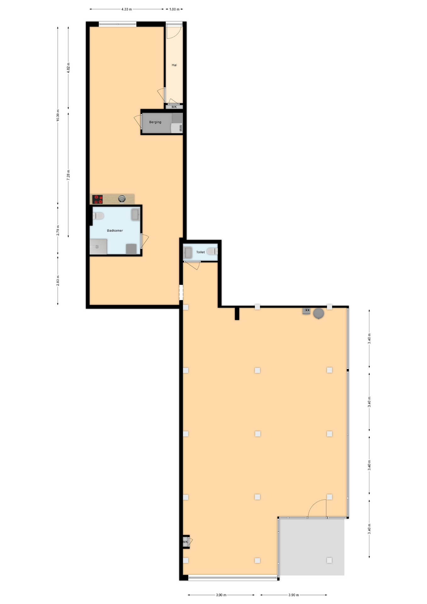 De commerciële ruimte heeft een totale oppervlakte van ca. 208 m² en kenmerkt zich door de royale raampartijen aan zowel de voor- als zijkant. De commerciële ruimte bestaat uit twee afzonderlijke ruimtes: een grote open ruimte aan de voorzijde met prachtige raampartijen en aan de achterzijde een separate ruimte, welke uitermate geschikt als kantoor- of magazijnruimte.