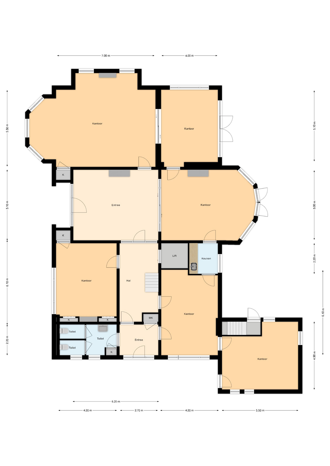 Het object is verdeeld over meerdere bouwlagen en uitsluitend per verdieping te huur. De totale oppervlakte van de kantoorvilla bedraagt ca. 675 m² en de verdiepingen variëren tussen de 201 m² en 263 m². De kantoorruimtes zijn flexibel indeelbaar en voorzien van moderne voorzieningen, terwijl de monumentale details zorgvuldig behouden zijn gebleven. Op zowel de begane grond als de verdiepingen bevinden zich royale ruimten, sanitaire voorzieningen en diverse balkonpartijen die het geheel extra allure geven.